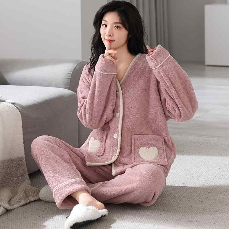 パジャマ レディース 女性用 ルームウェア 部屋着 上下セット 秋冬 サンゴフリース 裏起毛 厚手 保温 防寒 Vネック 開襟 長袖 ロングパンツ 外着可能 カジュアル 快適