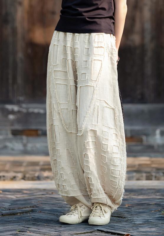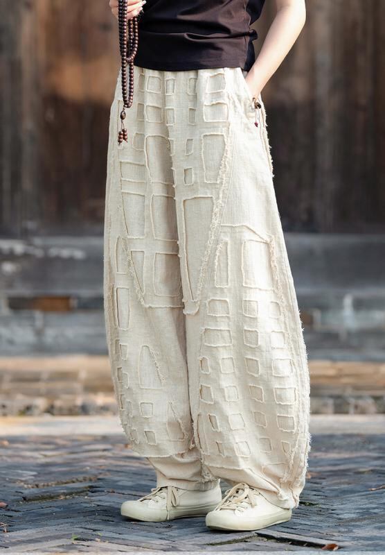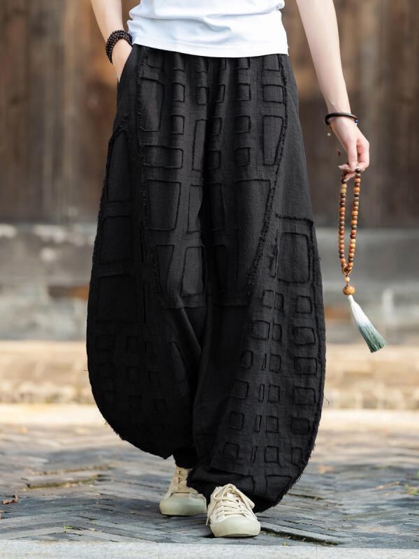 ワイドパンツ ユニセックス オリジナル 禅スタイル ナチュラル パッチワーク風 切りっぱなし ゆったり ルーズ バルーンシルエット リネン 麻 綿 普段使い リラックスウェア ルームウェア 中ウエスト 秋冬