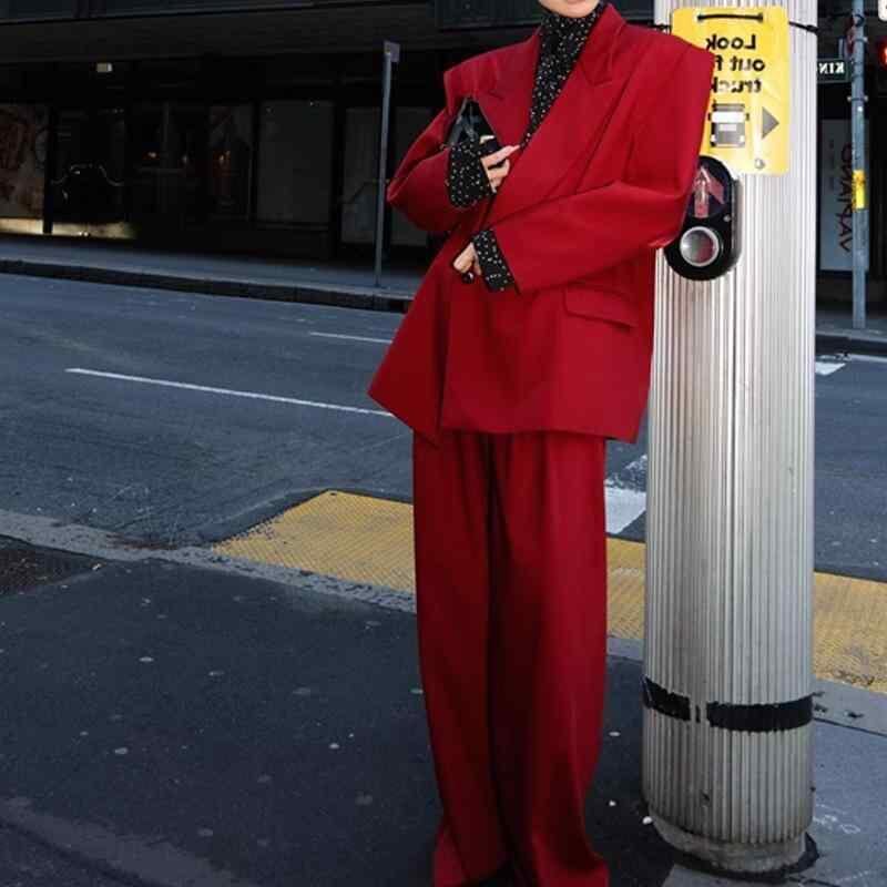 セットアップ レディース レッド ワイドシルエット ダブルボタン テーラードジャケット ハイウエスト ワイド カジュアルパンツ 高級感 2点セット 秋冬