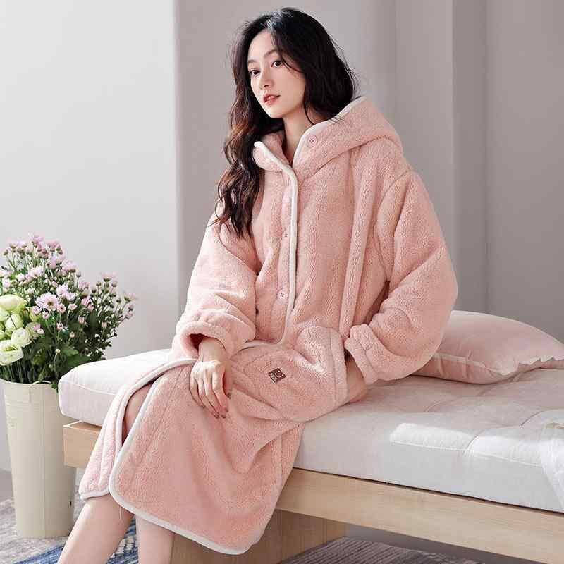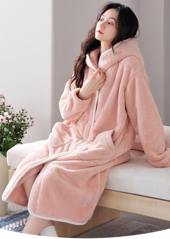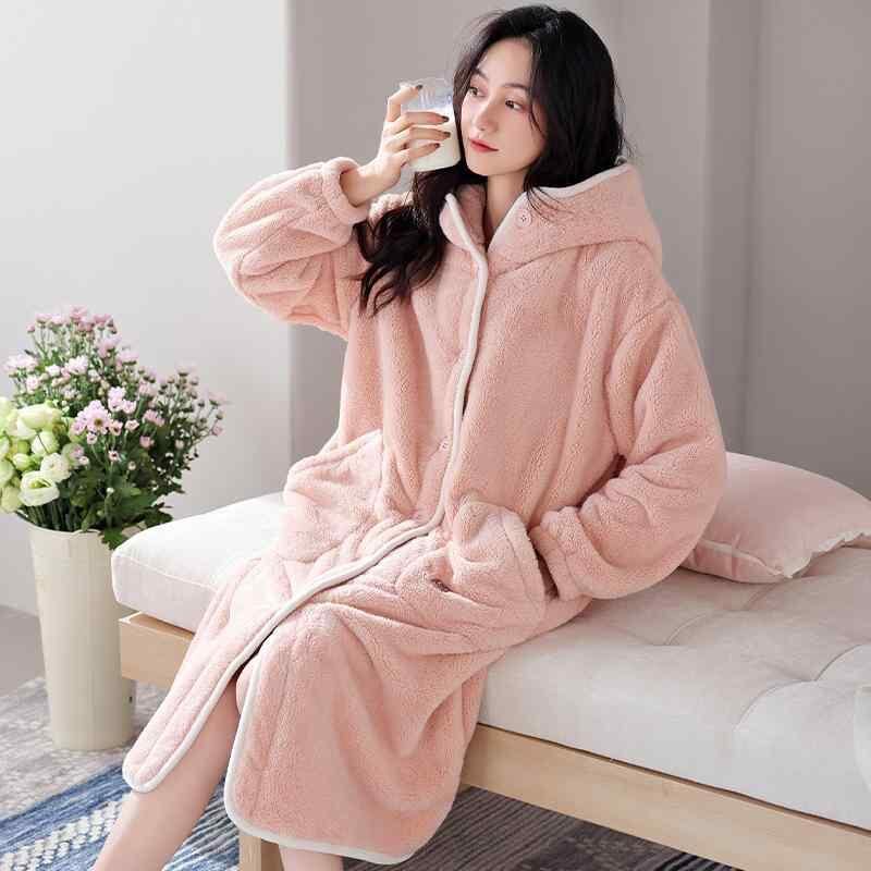ルームウェア レディース 女性用 秋冬 サンゴフリース フランネル ポリエステル フード付き ロング丈 あったか 保温 裏起毛 厚手 パジャマ ガウン バスローブ 部屋着 快適 ピンク系