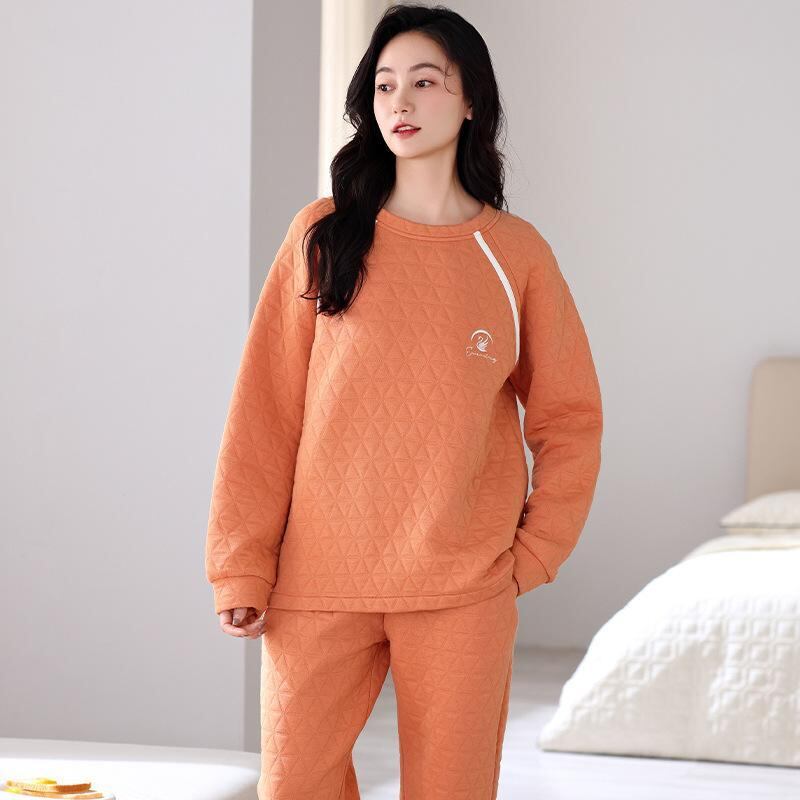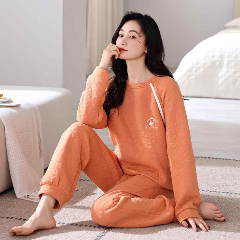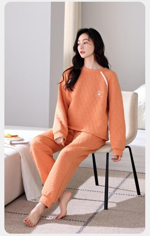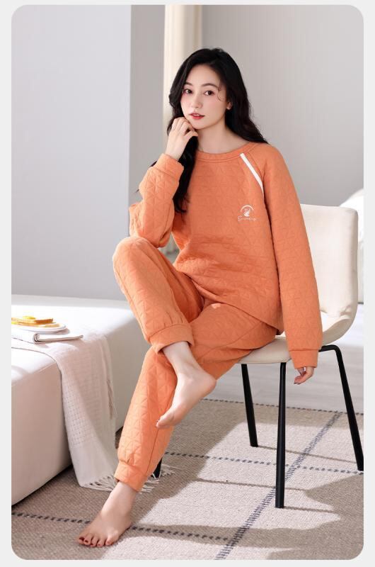 パジャマ レディース 女性用 秋冬 厚手 純綿 コットン エアコットン キルティング 中綿 長袖 保温 あったか 長ズボン ラウンドネック プルオーバー ルームウェア 部屋着 上下セット