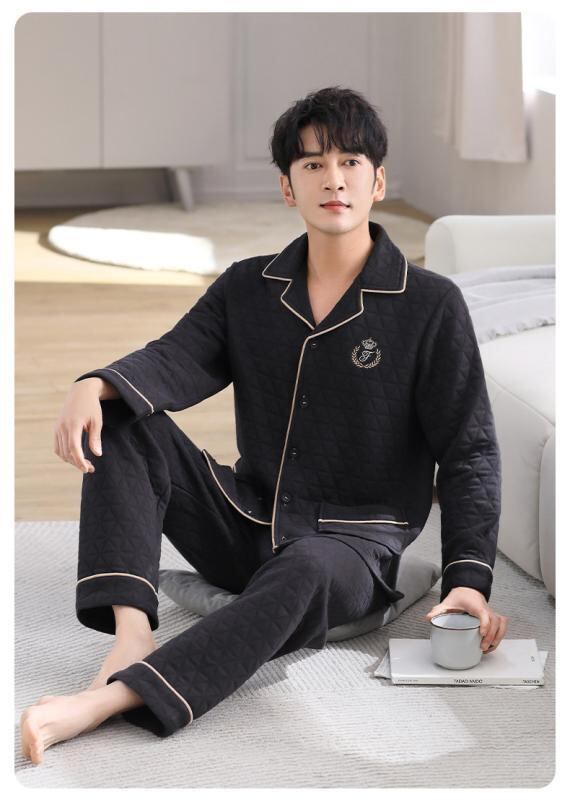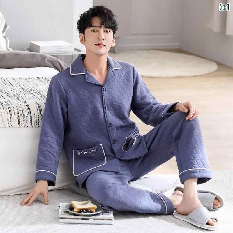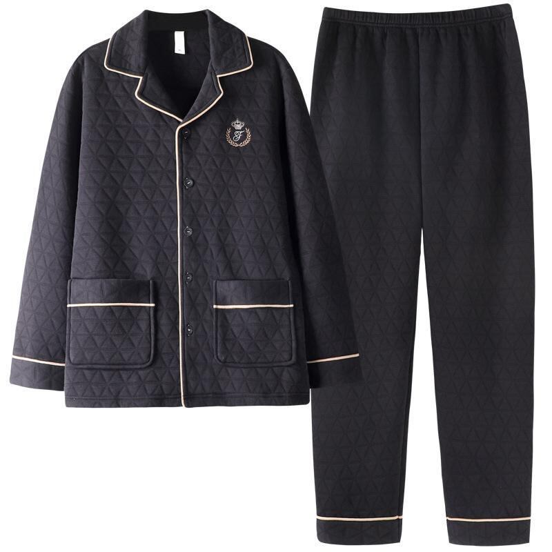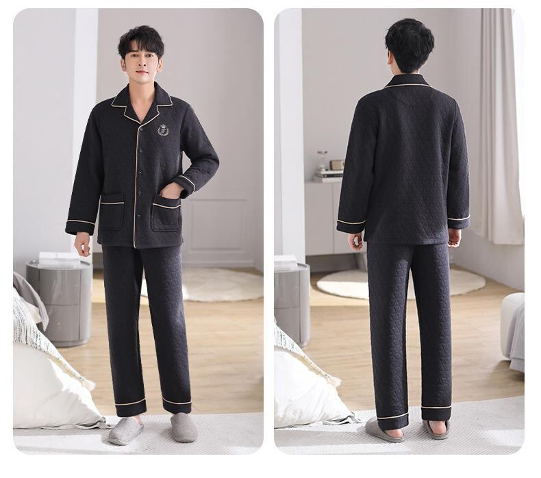 パジャマ メンズ 男性用 コットン 純綿 厚手 長袖 空気綿キルティング 中綿入り ルームウェア ナイトウェア 上下セット 前開き 秋 冬 部屋着 保温 快適 通気性 抗菌 ワンマイルウェア