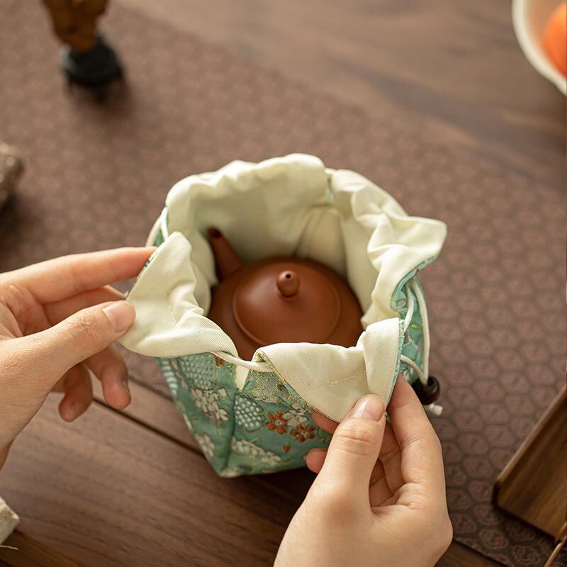 茶器収納バッグ 手作り 蘇州刺繍風 厚手 ざくろ花柄 オリエンタルデザイン 旅行 アウトドア ポータブル ティーセット 急須 カップ トラベルポーチ 上品 布製