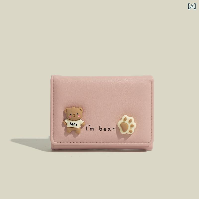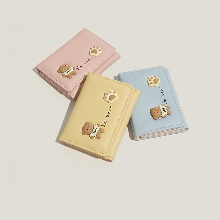 ミニ財布 レディース 女性用 コンパクト かわいい クマ ベア 薄型 スリム 三つ折り PUレザー カード入れ 多収納 ウォレット 防水 普段使い ピンク ブルー イエロー
