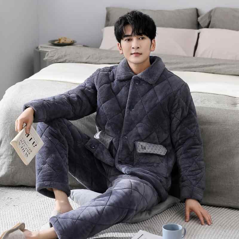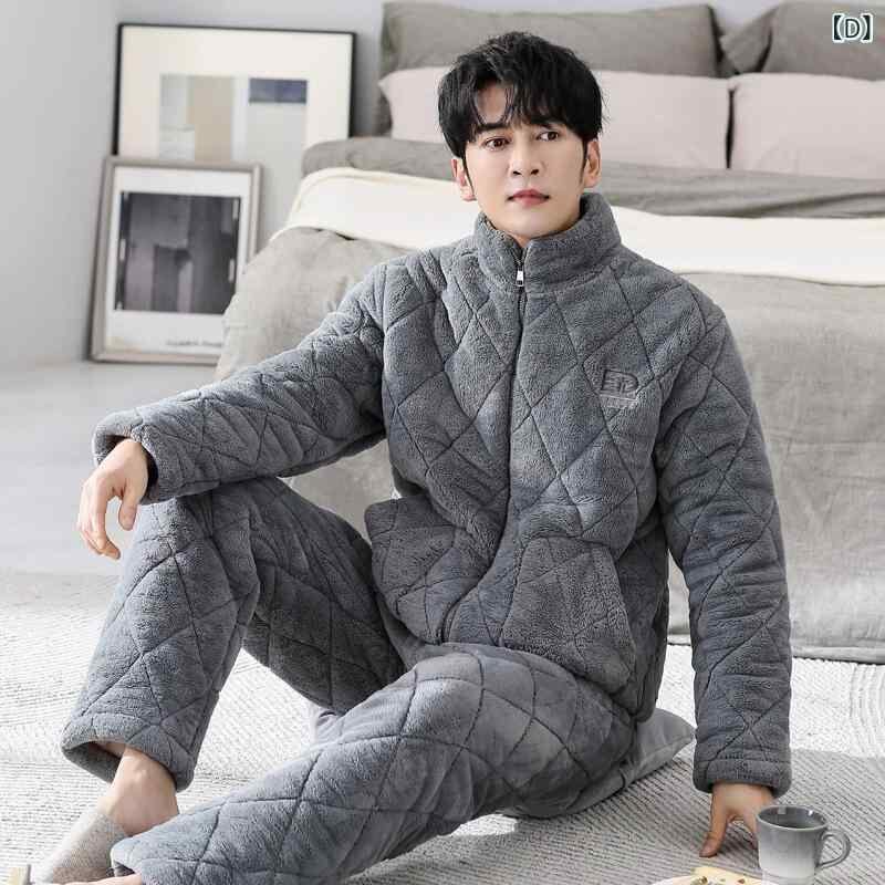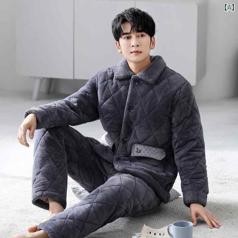 ルームウェア パジャマ 男性用 冬物 極厚 三層構造 中綿入り サンゴフリース もこもこ フリース素材 あったか 保温性 快適 前開き 長袖 長ズボン 部屋着 外出着 ワンマイルウェア 上下セット