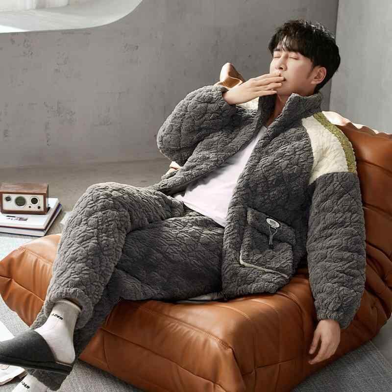 ルームウェア メンズ 男性用 秋冬 サンゴフリース 三層中綿入り 極厚 裏起毛 あったか 保温 快適 通気性 襟付き 長袖 長ズボン 外着 ジップアップ 上下セット 普段使い 部屋着 カジュアル シンプル