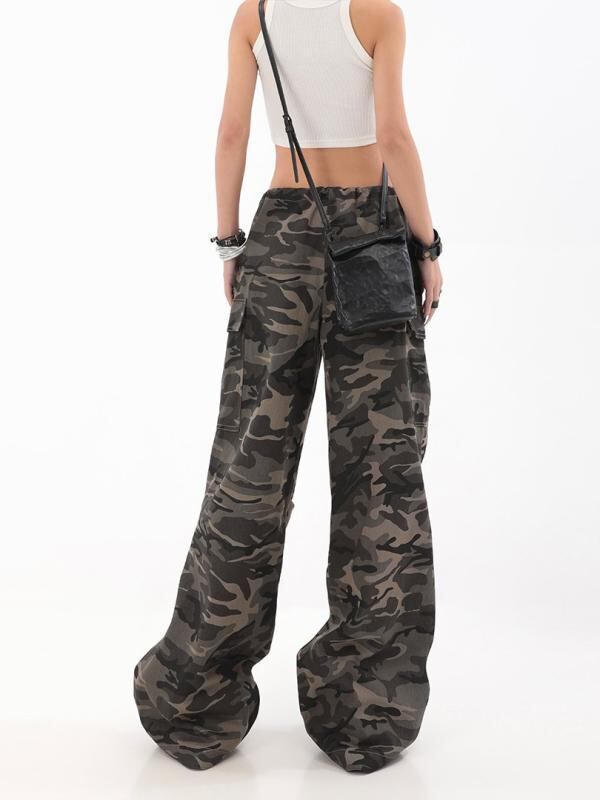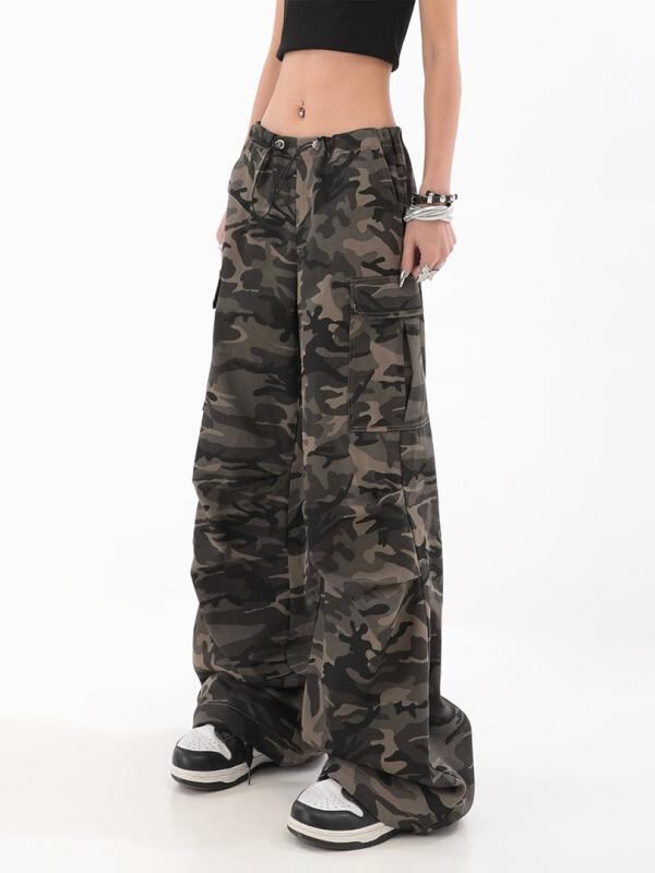 パンツ レディース アメカジ ストリート ダンス 迷彩 カモフラージュ カーゴパンツ ワークパンツ ゆったり ワイド ストレート ハイウエスト フルレングス ドレープ 落ち感 ポリエステル ノンストレッチ カジュアル リラックス 普段使い 秋冬