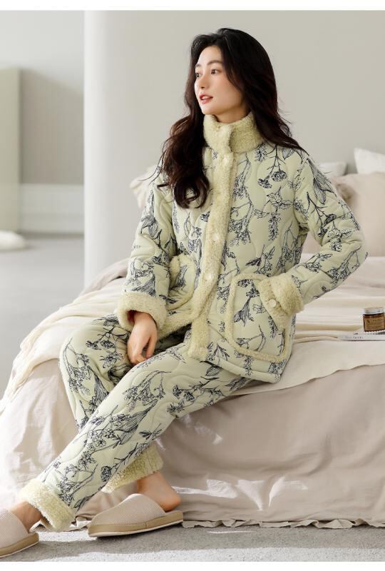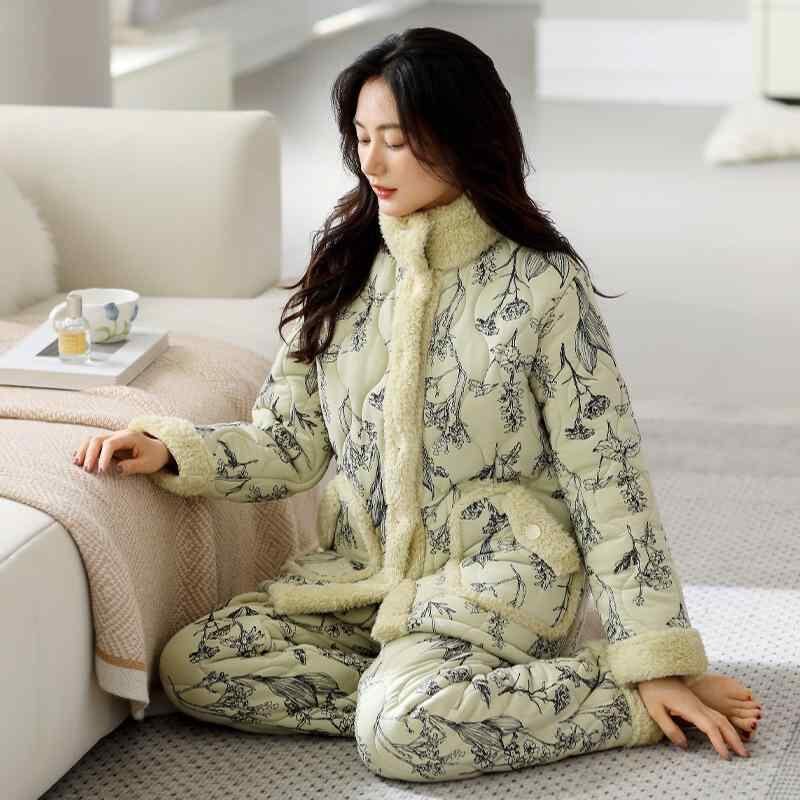 パジャマ レディース ルームウェア 女性用 秋冬 純綿 三層キルティング 中綿入り 裏起毛 厚手 保温 あったか セットアップ 前開き 長袖 長ズボン スタンドカラー 部屋着 ワンマイルウェア