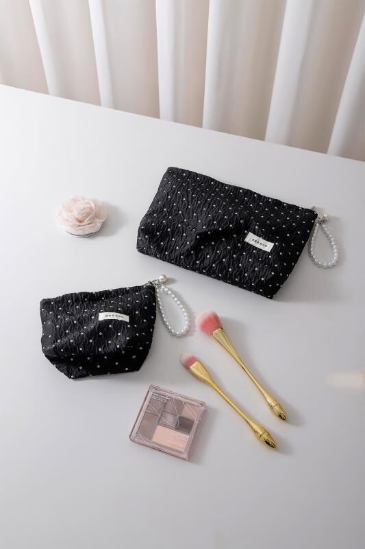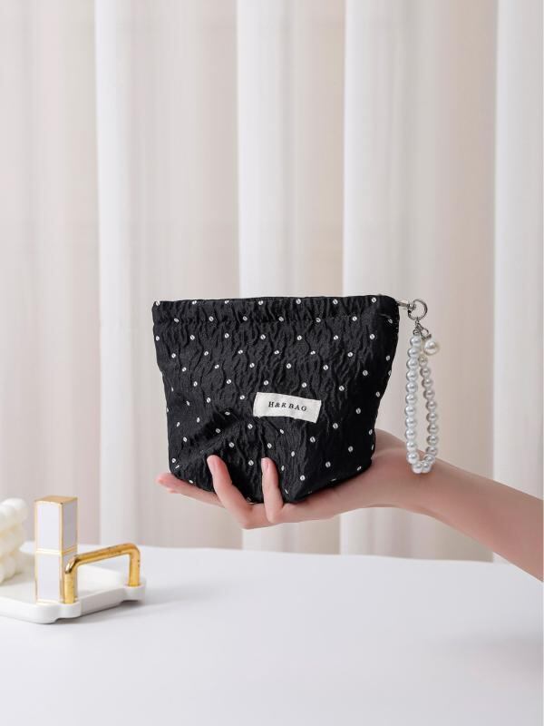 コスメポーチ レディース ブラック ドット柄 大容量 旅行 トラベル スキンケア 洗面用品 収納 キャンバス生地 普段使い デイリーユース 手持ち クラッチバッグ