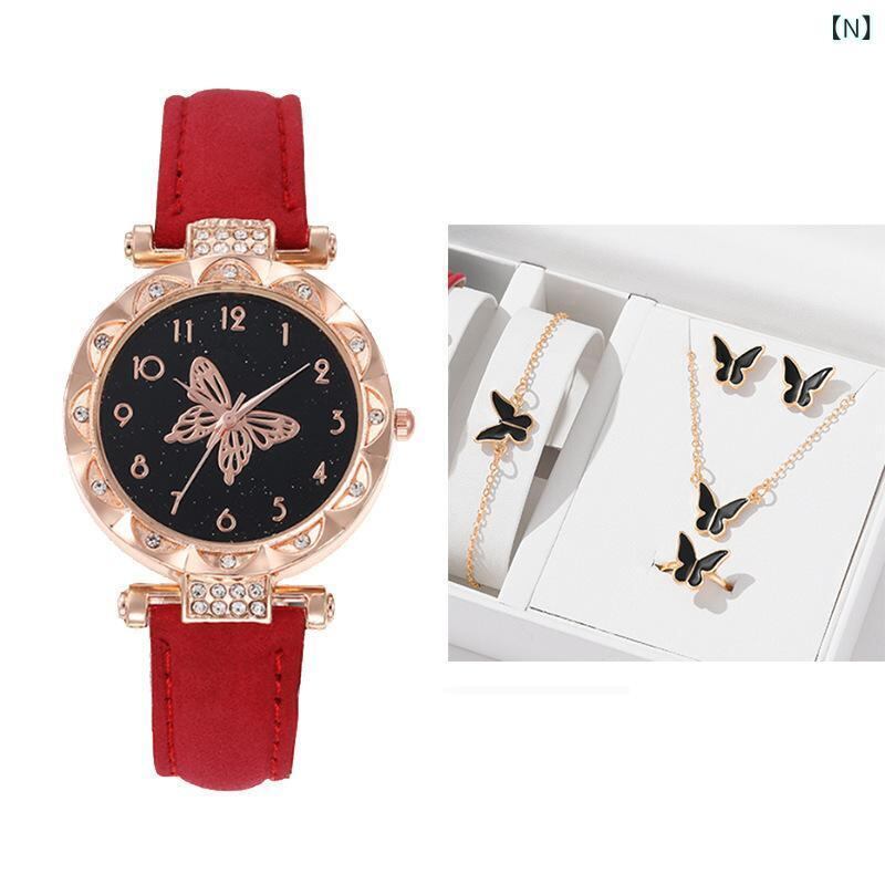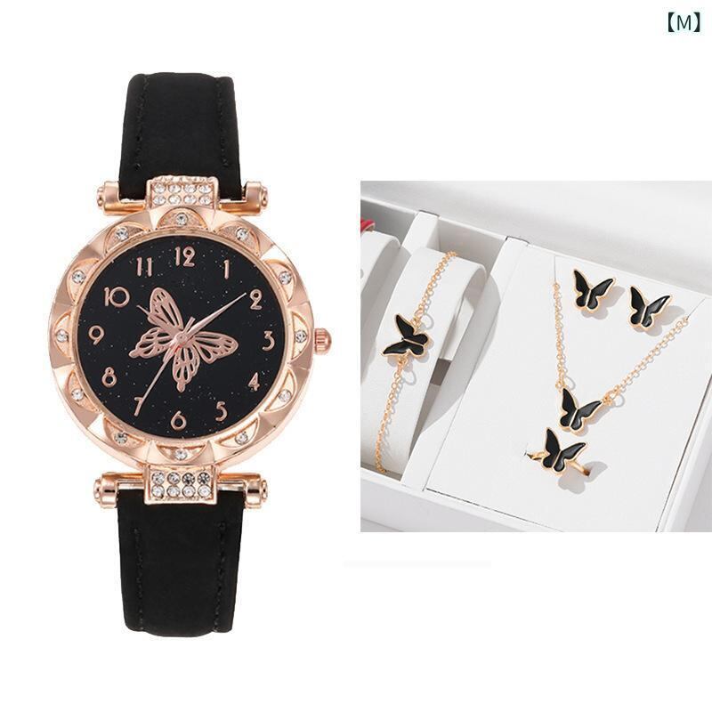 腕時計 レディース ブレスレットウォッチ クォーツ ラウンド型 シンプル ファッション バタフライ 蝶 5点セット カジュアル 普段使い アクセサリー 女性用 ウォッチセット