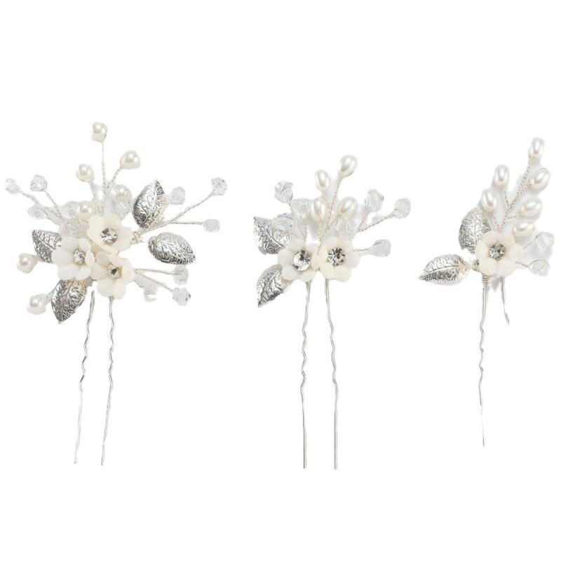 ヘアアクセサリー 白い陶器製 花 葉 3個セット ウェディング 結婚式 披露宴 花嫁 前撮り かんざし 髪飾り ヘッドドレス ポリマークレイ ハンドメイド ナチュラル シルバー