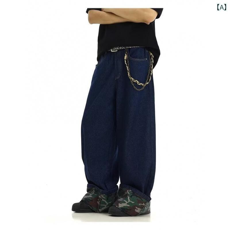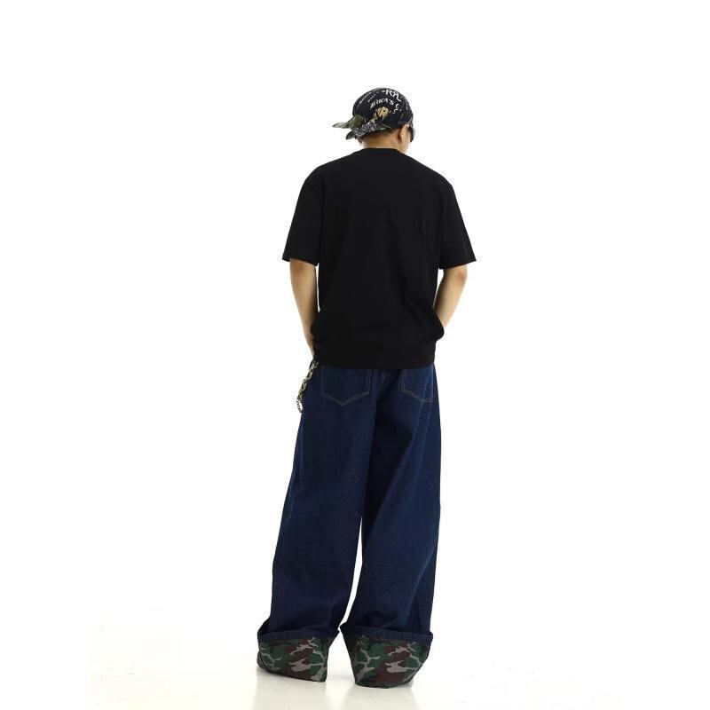デニムパンツ メンズ カモフラージュ 切り替え ロールアップ ワイド カーブシルエット ゆったり ルーズフィット 細見え効果 アメカジスタイル ウォッシュ加工 綿混コットン素材 ミドルウエスト カジュアル 普段使い ブルー