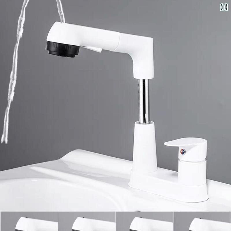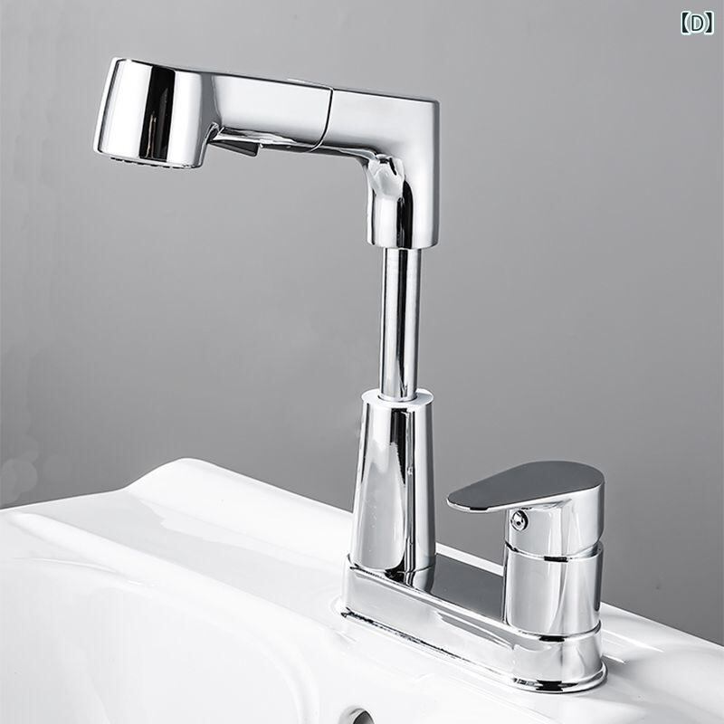 洗面台 蛇口 2穴 混合水栓 冷温水対応 伸縮プルアウト シャワーヘッド 昇降機能 5モード出水 真鍮製 家庭用 モダン スタイリッシュ 高級感 シルバー ブラック ゴールド ホワイト