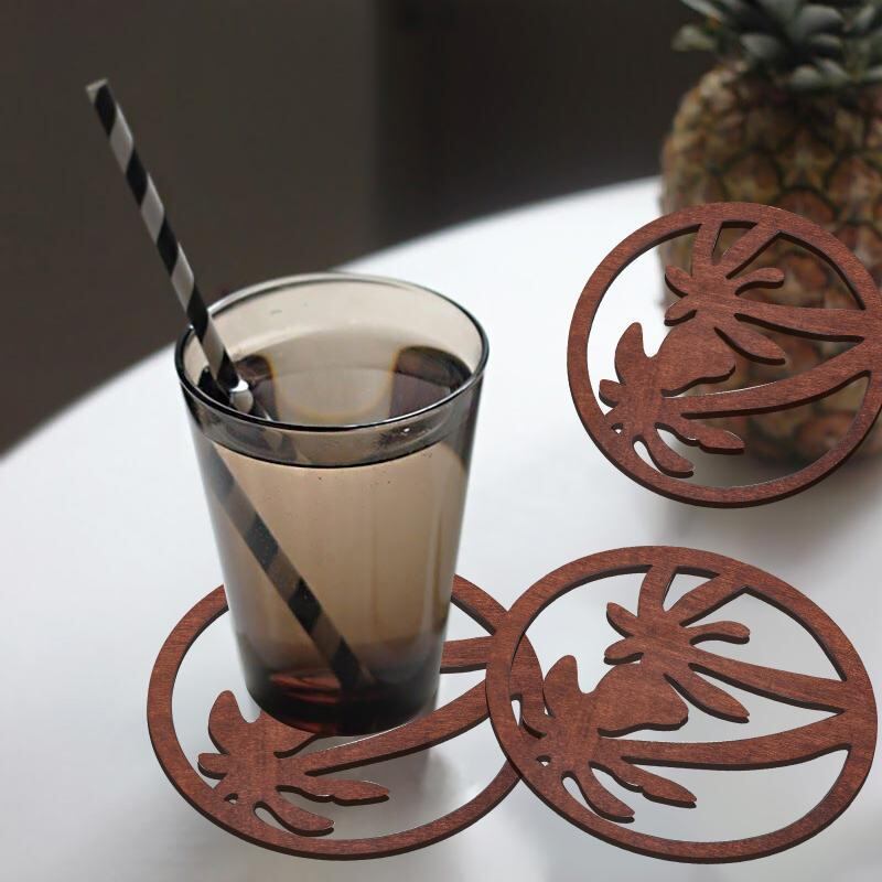 コースター ウッド ブラウン 丸型 ヤシの木柄 透かし彫り おしゃれ アメリカン風 デザイン 汚れ防止 断熱 テーブル保護 キズ防止 4枚セット