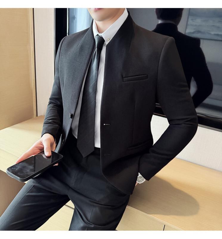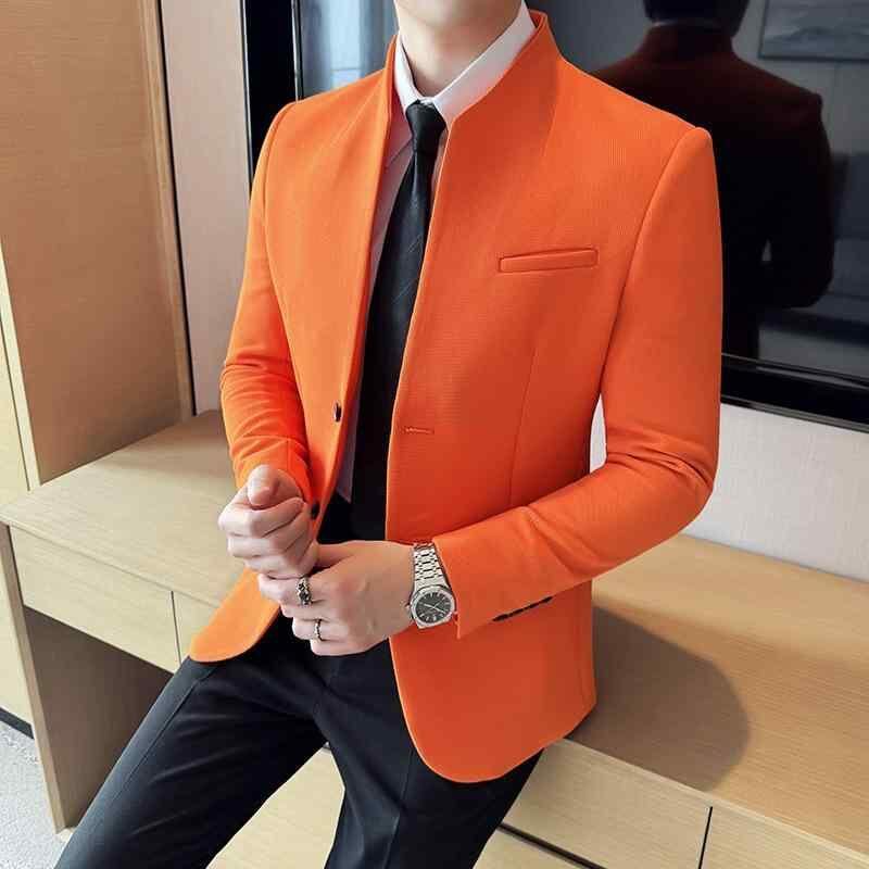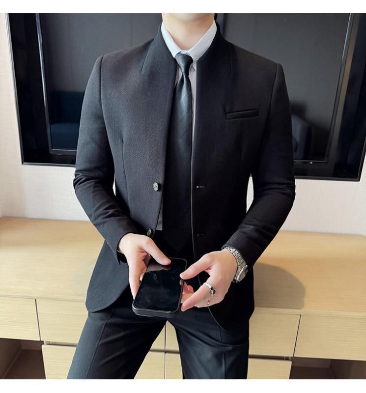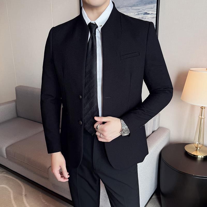 ジャケット ブレザー メンズ 男性用 春秋 ワッフル生地 ポリエステル 新中華風 スタンドカラー 立ち襟 スリムフィット 細身 ビジネス カジュアル 通勤 オフィスカジュアル 通気性 形態安定 吸汗速乾 無地 ブラック ブルー