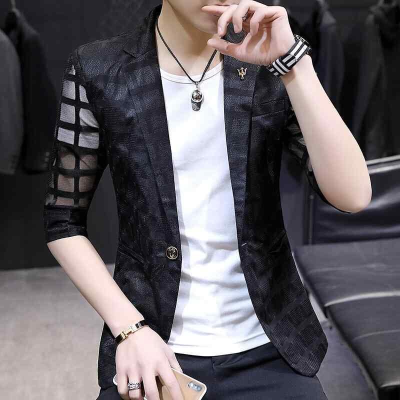 テーラードジャケット メンズ 男性用 カジュアル 韓国風 薄手 軽量 接触冷感 透かし編み 七分袖 ストレートシルエット テーラードカラー シングルブレスト 一つボタン 普段使い ビジネスカジュアル ホワイト ブラック ブルー