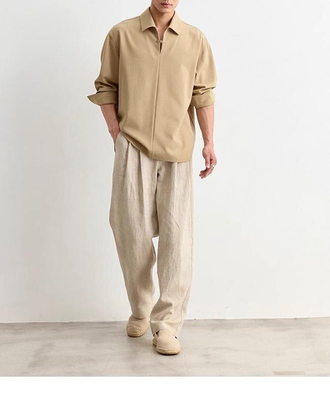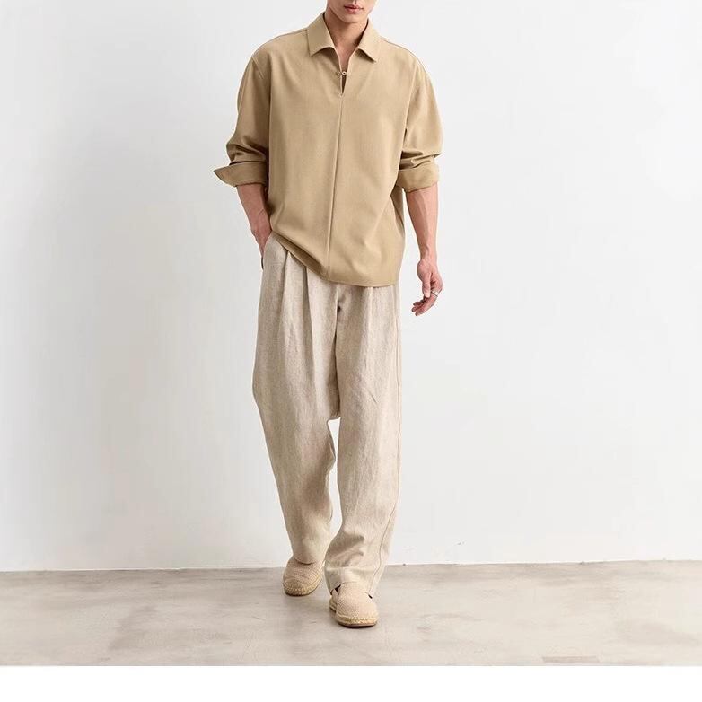 ポロシャツ メンズ 男性用 竹節感 編み地 半開襟 中華ボタン 長袖 薄手 ゆったり ルーズフィット カジュアル ポリエステル 化学繊維混紡 無地 春秋 ベージュ サンドカラー