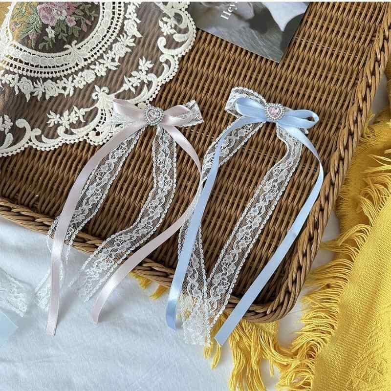 ・素材: レース・種類: ダックビルクリップ・加工方法: 手作り・カラー展開: ピンクシアー、ブルーシアー、ピンクサテンリボン、ブルーサテンリボン・柄: ハート・スタイル: 韓国風・スタイル分類: 清新フェミニン・カテゴリ: ヘアアクセサリー・対象: 女性用