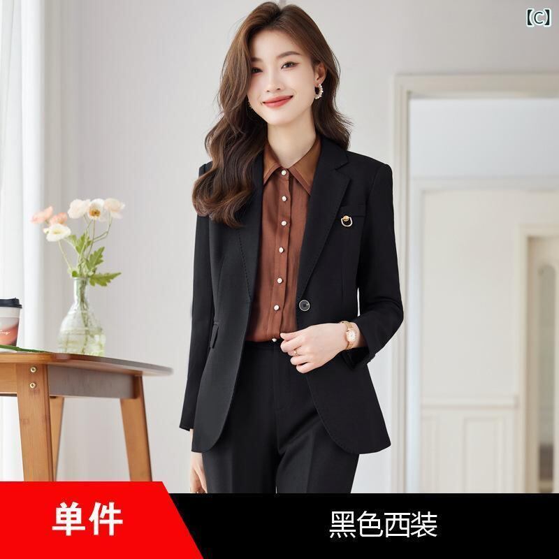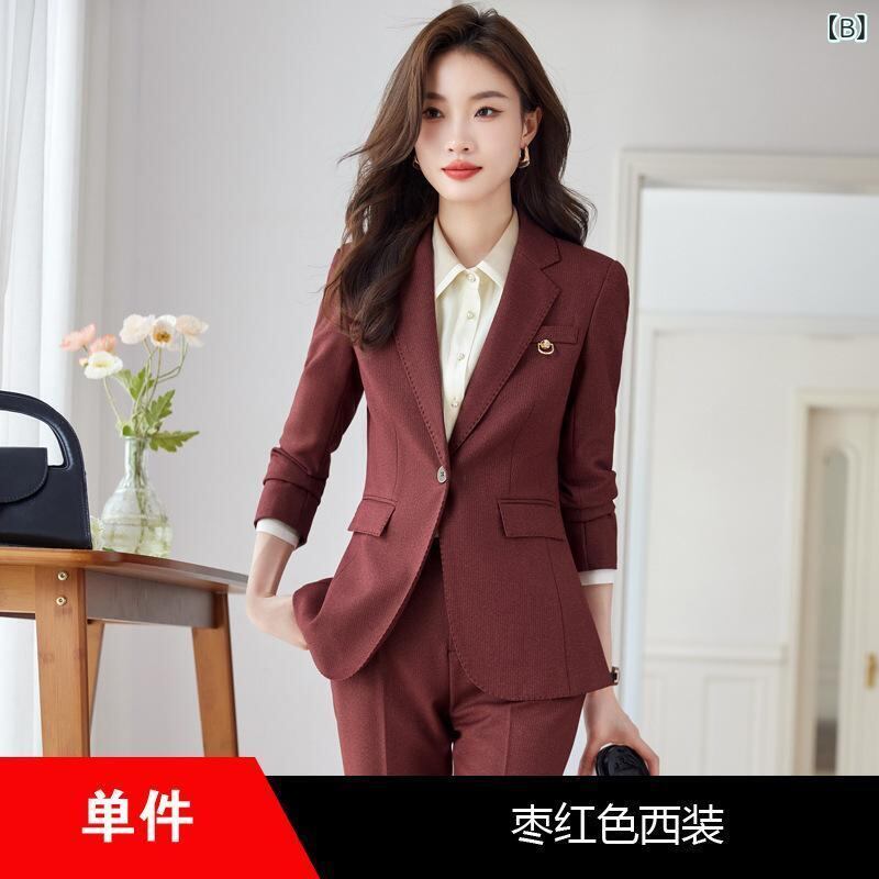 ・カラー展開: カフェ色ジャケット, ワインレッドジャケット, ブラックジャケット, カフェ色ジャケット+パンツ, ワインレッドジャケット+パンツ, ブラックジャケット+パンツ