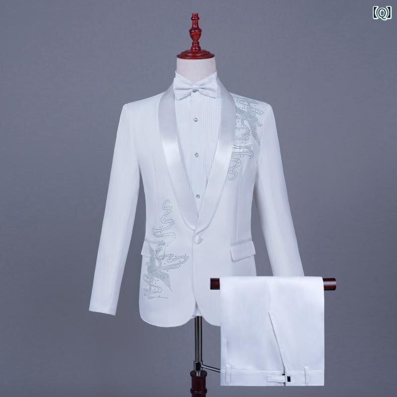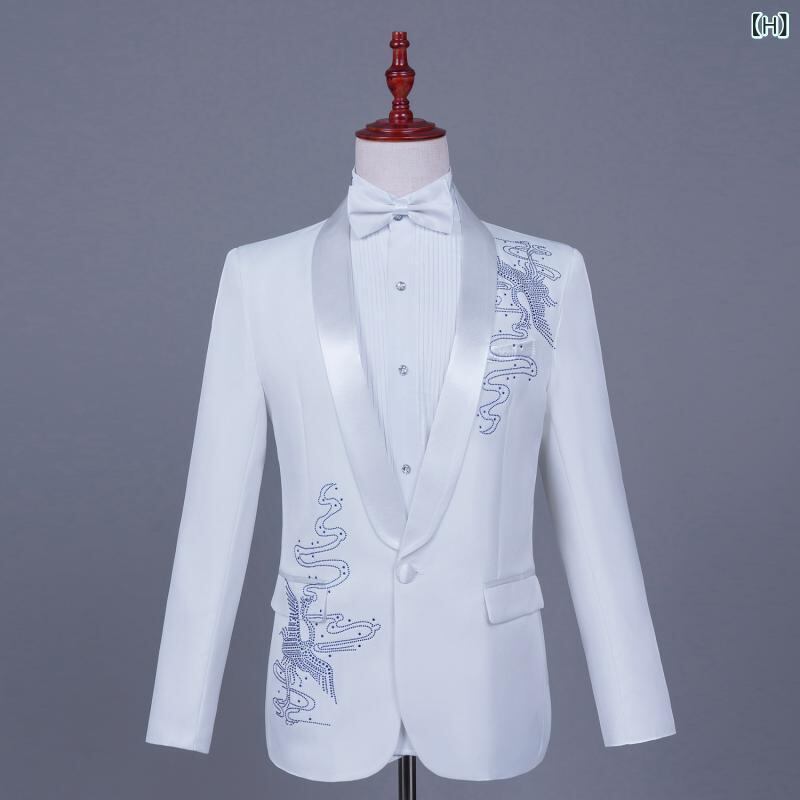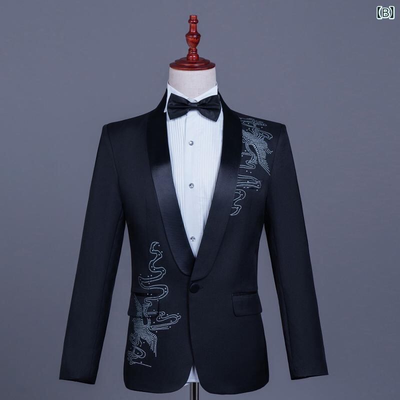 ジャケット メンズ ショールカラー へちま襟 鳳凰柄 フェニックス柄 カラーストーン ラインストーン 舞台衣装 ステージ衣装 発表会 演奏会 合唱 司会 歌手 フォーマルウェア スリムフィット 華やか 豪華 光沢 黒 白