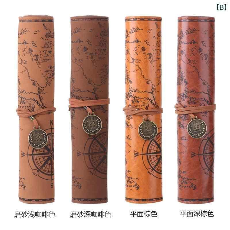 ペンケース レディース 女性用 宝の地図 クリエイティブ レトロ ビンテージ 中国風 アジアンテイスト ロールペンケース 巻き型 大容量 多機能 キャンバス PUレザー 革製 学生用 筆箱 手帳 文具ケース 韓国風 ブラウン系 ダークブラウン系