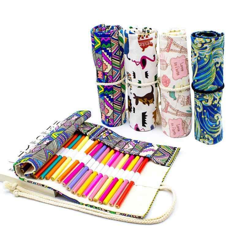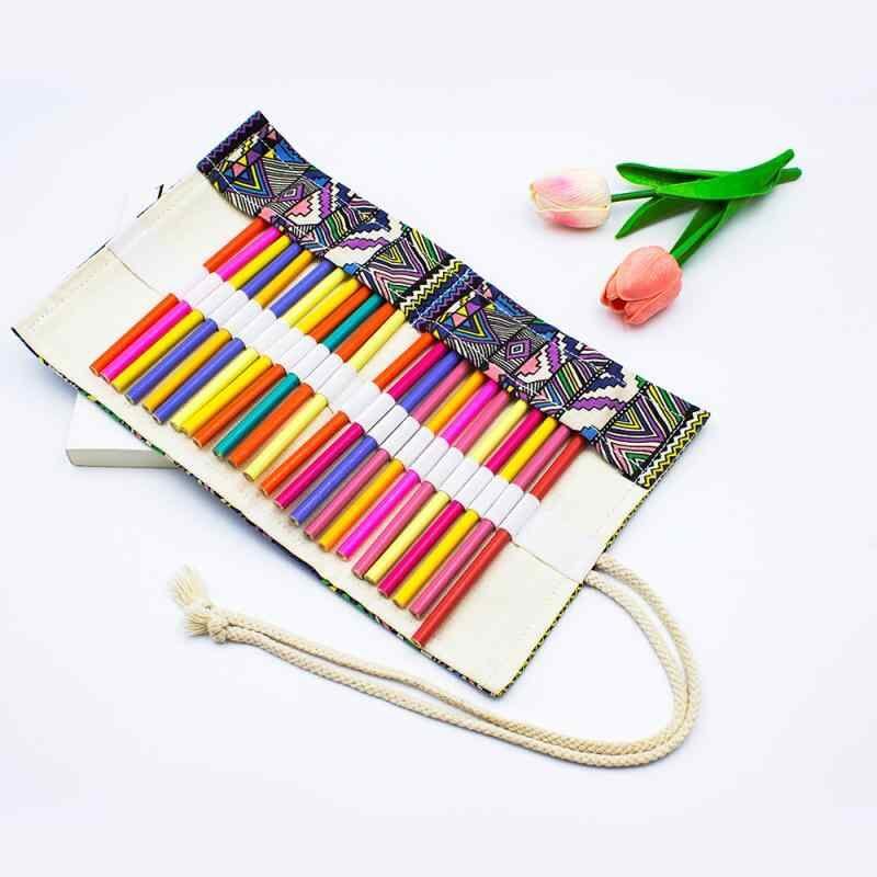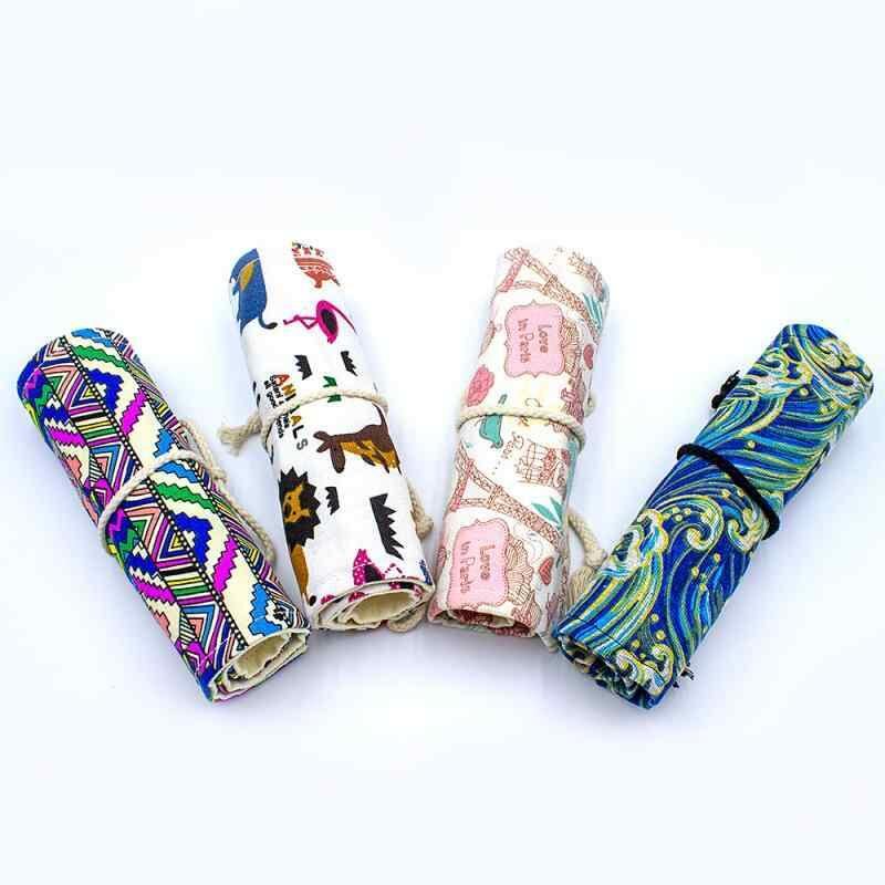 ペンケース ロールペンケース キャンバス 24本収納 大容量 シンプル 男女兼用 学生用 色鉛筆 デッサン 画材入れ 文房具 筆記用具 収納 持ち運び エスニック花柄プリント
