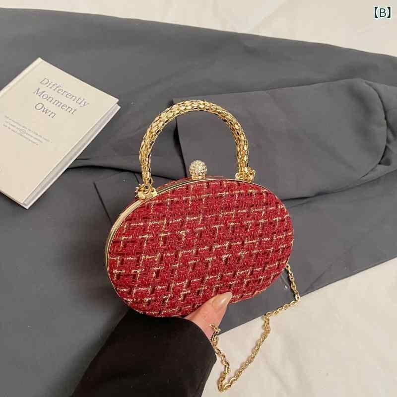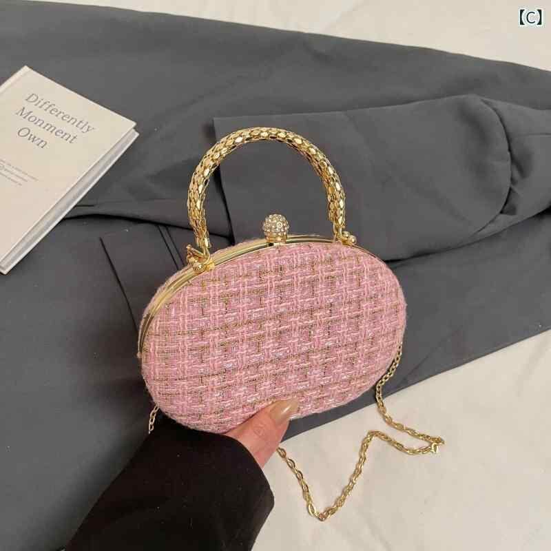 がま口 レディース レトロ ボックス型 ハンド ショルダー 2WAY イブニング パーティー チェーン ロック金具 ツイード調 高級感 エレガント シンプル 春夏
