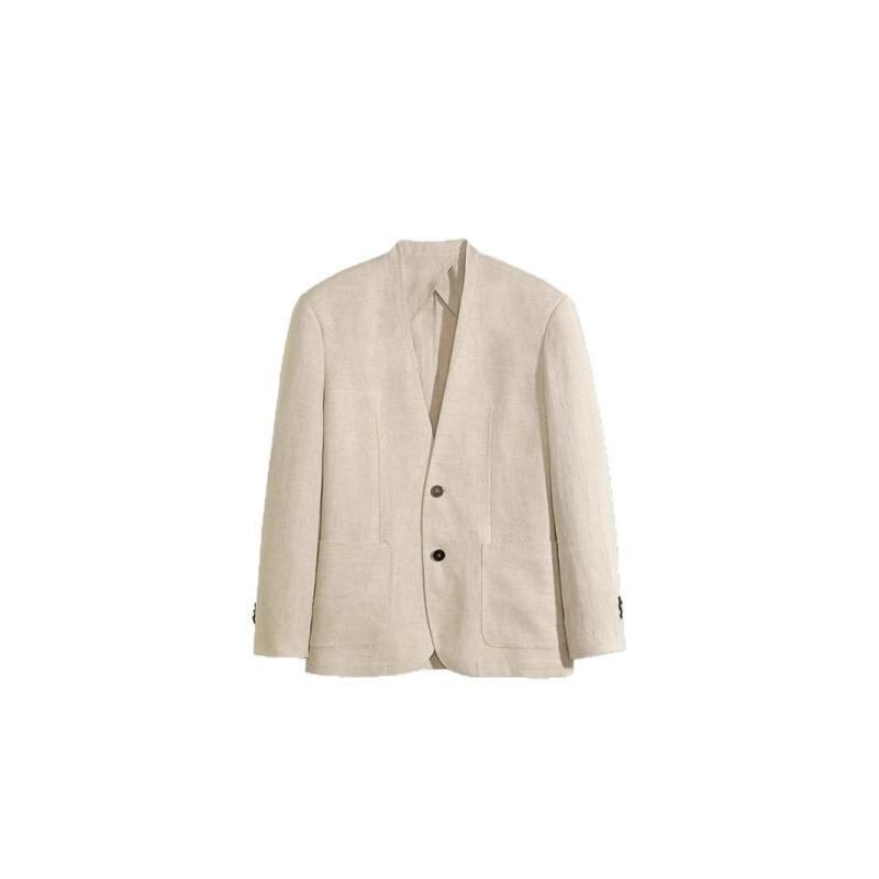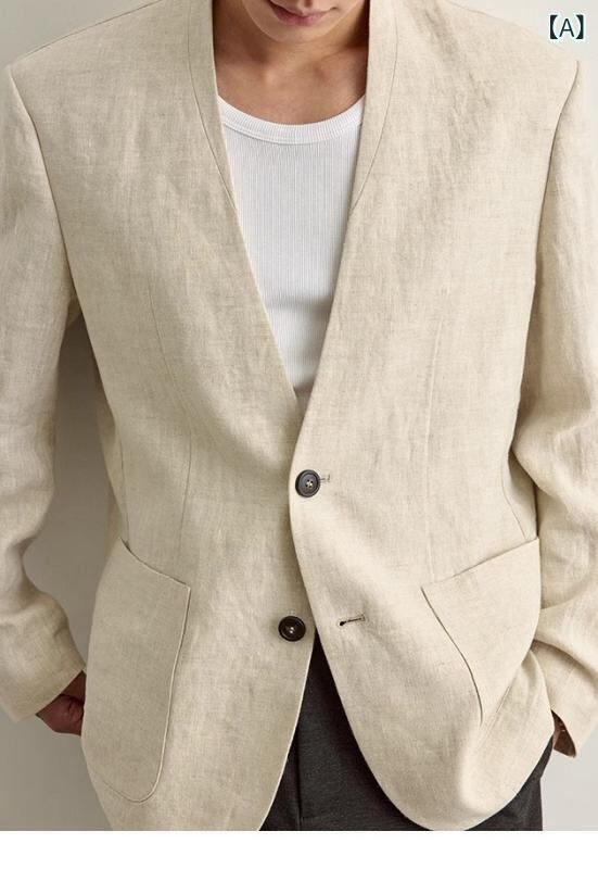 ジャケット メンズ 春夏 厳選 ノーカラー 麻 リネン 肩パッド入り ストレートショルダー バイカラーボタン シンプル スリムフィット カジュアル きれいめ アウター ナチュラルカラー
