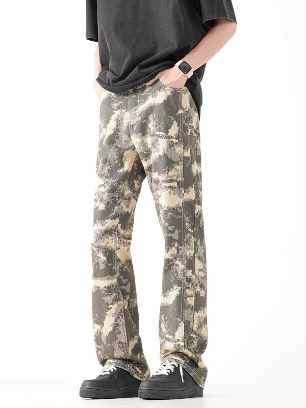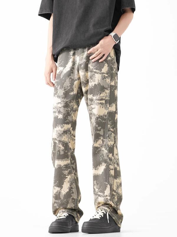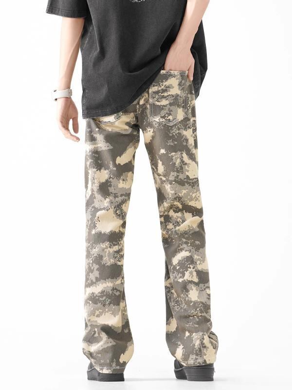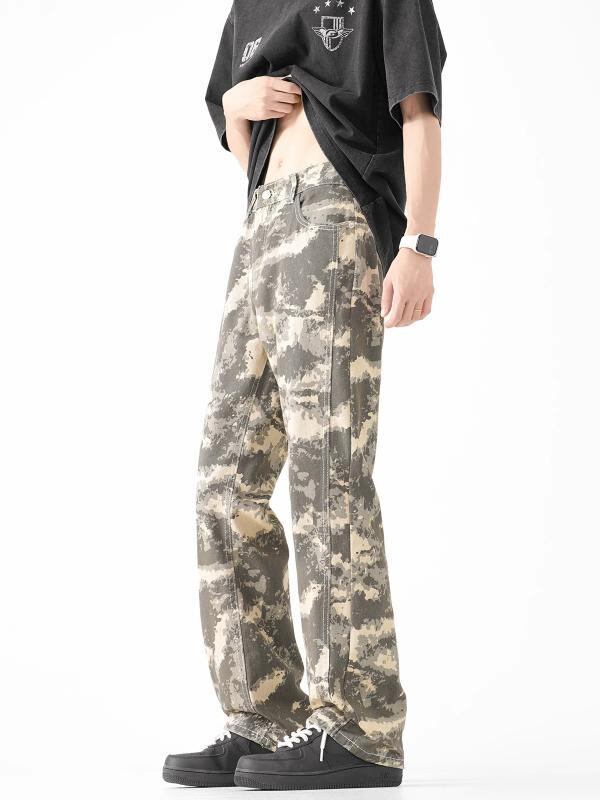 デニムパンツ メンズ レトロ アメリカン ストリート 迷彩柄 ゆったり ルーズ ストレート セミフレア コットン ウォッシュ加工 ロング丈 ミドルウエスト 普段使い カジュアル