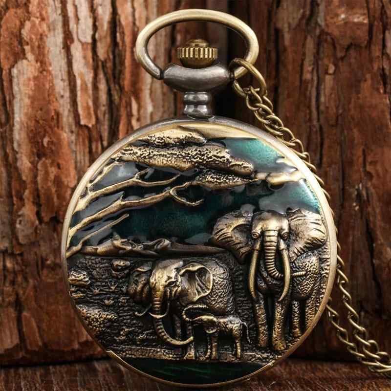 懐中時計 ユニセックス アンティーク 古銅色 ブロンズ 鶴 象 アニマルデザイン クォーツ アナログ表示 丸型文字盤 レトロ ポケットウォッチ 合金製 ファッション おしゃれ ギフト