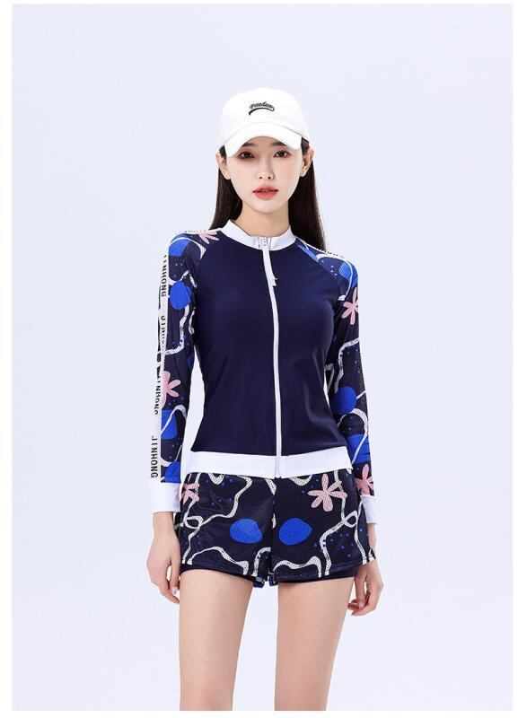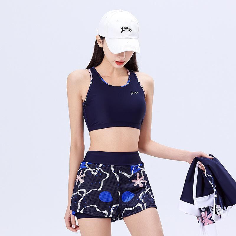 水着 レディース セパレート 3点セット 体型カバー 細見え 着痩せ 露出控えめ パッド付き ノンワイヤー スポーツ アクティブウェア おしゃれ 上品 花柄 ポリエステル 紺色 ネイビー 春夏