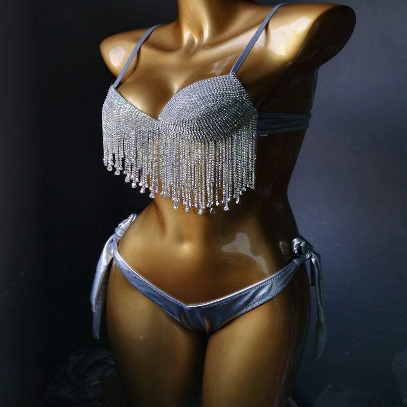 ビキニ レディース ワイヤー入り ハードカップ ラインストーン フリンジ ピンク ブラック シルバー セクシー ナイトクラブ 三角ビキニ セパレート プール ビーチ リゾート 春夏
