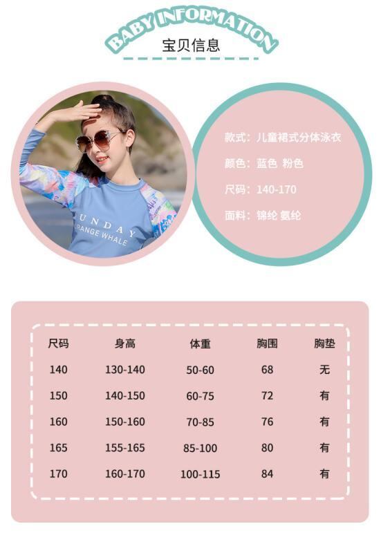 水着 女の子 キッズ ジュニア スクール水着 長袖 セパレート スカート一体型 ポリエステル 伸縮性 快適 プール ビーチ スイミング 春夏 ピンク ブルー