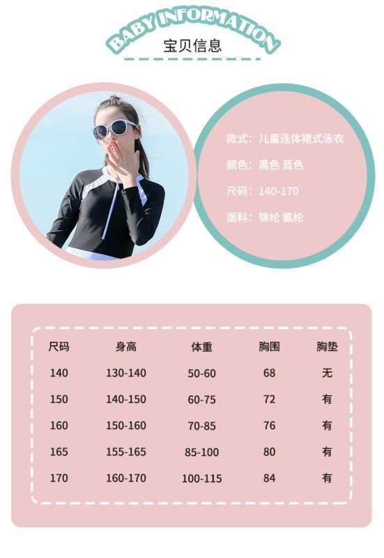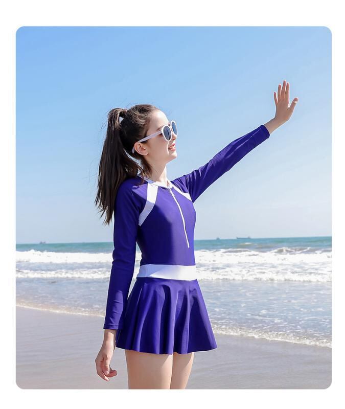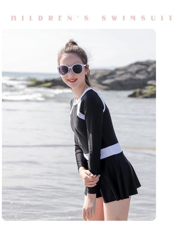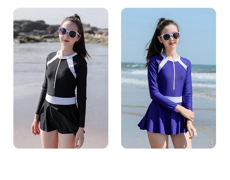 スイムウェア 女の子 キッズ ジュニア ワンピースタイプ 長袖 ロングスリーブ 切り替え 配色 ストレッチ 高伸縮性 ポリエステル UVカット プール 海水浴 ビーチ アウトドア 快適 ブラック ブルー