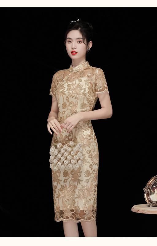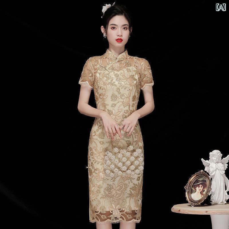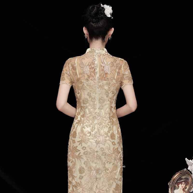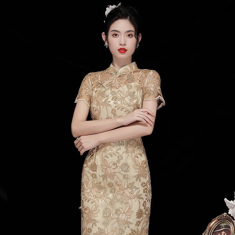 チャイナドレス レディース 改良型 刺繍 ロング丈 半袖 スタンドカラー スリット ポリエステル シャンパンゴールド フォーマル パーティー レトロ 中国風 春夏