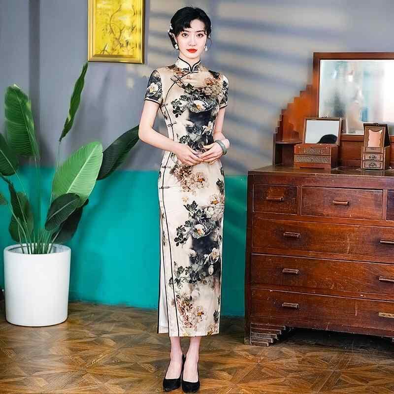 チャイナドレス レディース ロング丈 上品 エレガント マルベリーシルク ハイネック 七分袖 ハイウエストスリット 春夏 レトロ 高級感 快適