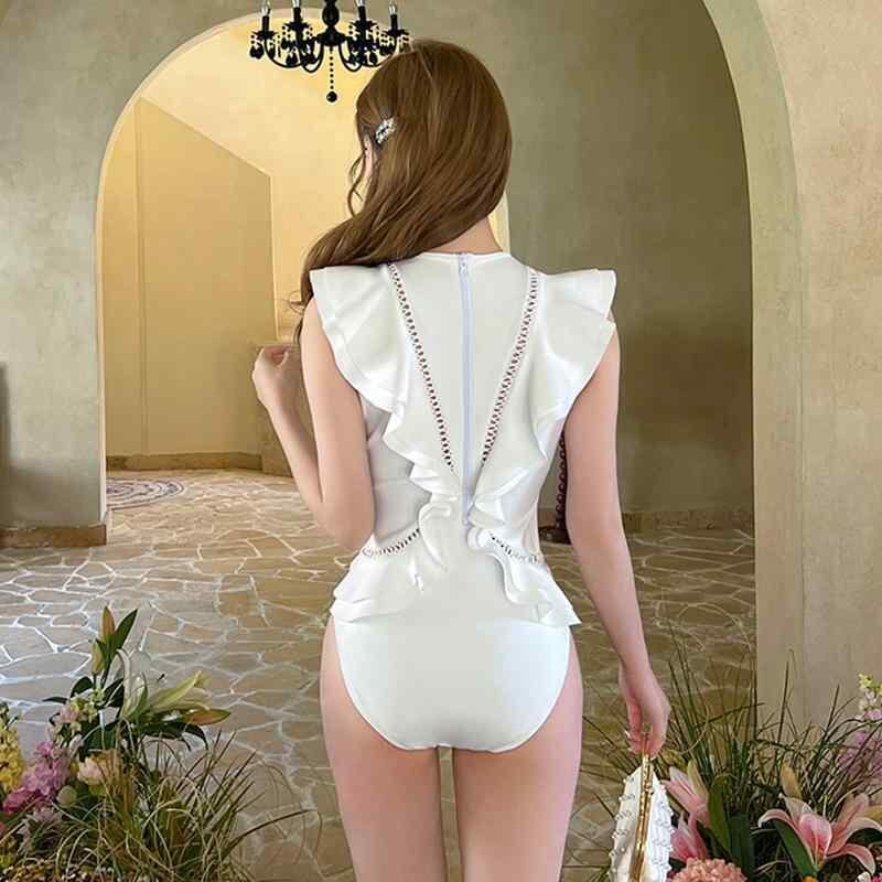 水着 レディース ワンピース スイムウェア 体型カバー フリル ラッフル セクシー 上品 魅力的 爽やか 温泉 リゾート プール 海水浴 パッド付き ノンワイヤー 白 ホワイト ハイウエスト 細見え 着痩せ