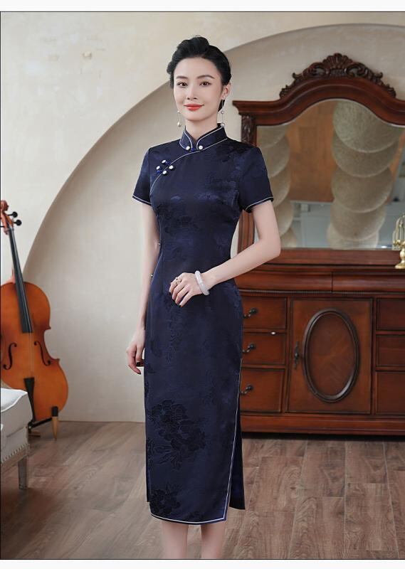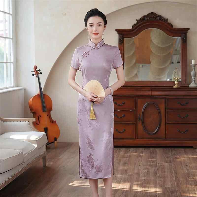 チャイナドレス レディース シルク 絹 高級感 改良型 中国風 レトロ クラシック スタイルアップ 細見え ミドル丈 ワンピース スタンドカラー 斜め襟 3分袖 スリット 春夏 ジャガード織り 手作業飾りボタン ピンク グリーン
