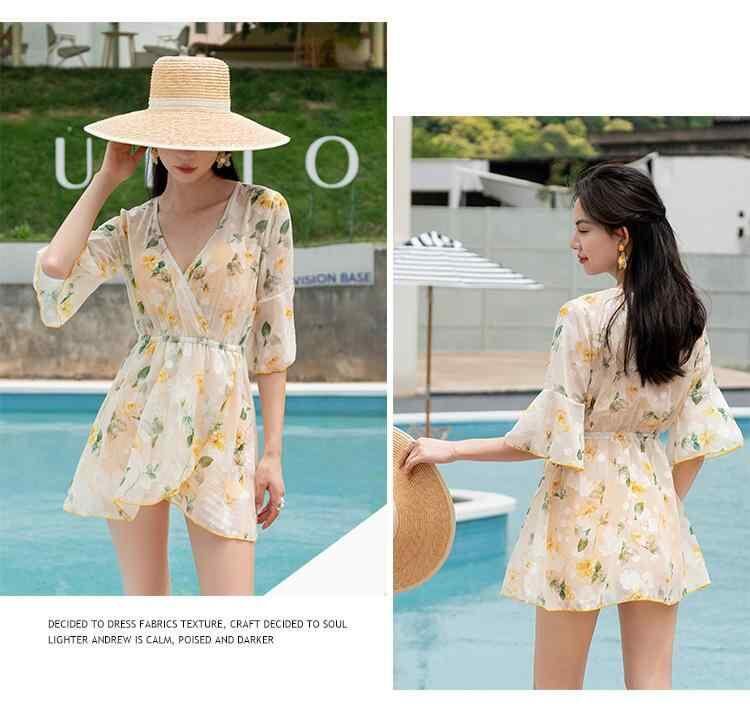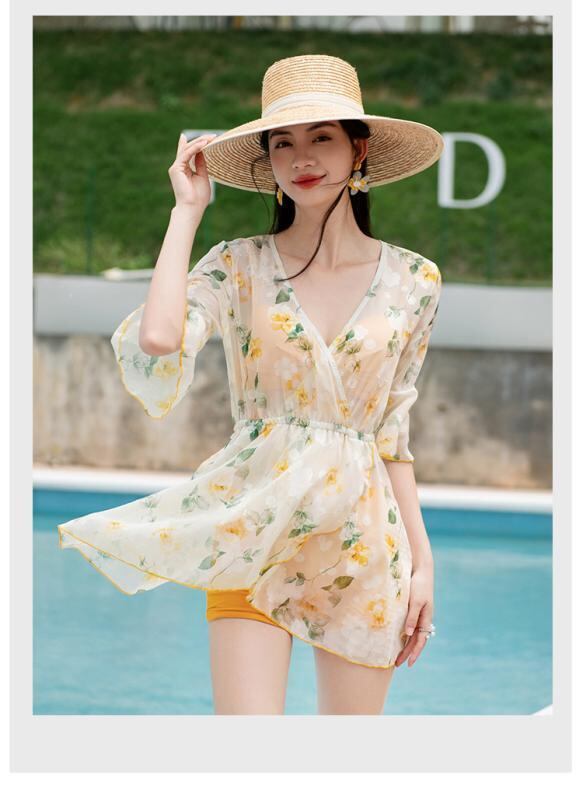 水着 レディース 3点セット プリント柄 韓国風 大きいサイズ 体型カバー セクシー 谷間メイク パッド入り ワイヤー入り セパレート リゾート水着 速乾 ハイウエスト 黄色 春夏