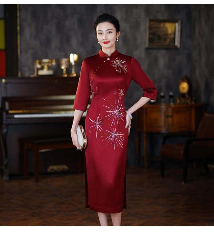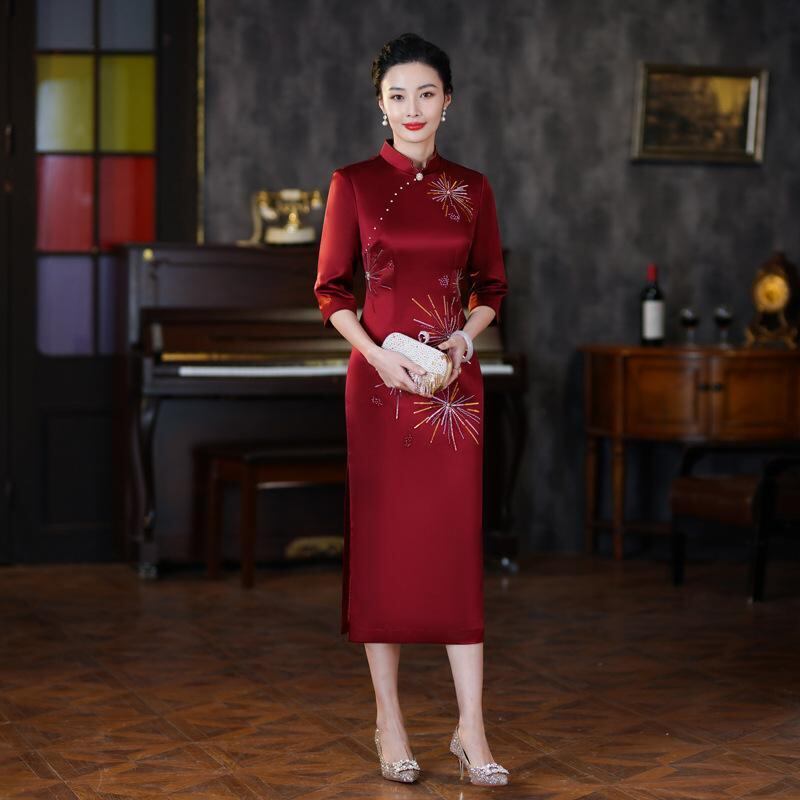 チャイナドレス レディース ミセス 母親 結婚式 披露宴 フォーマル アセテート ポリエステル 上品 エレガント 高級感 スタンドカラー 七分袖 刺繍 スリット ミドル丈 春夏