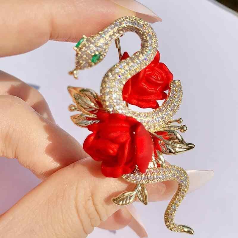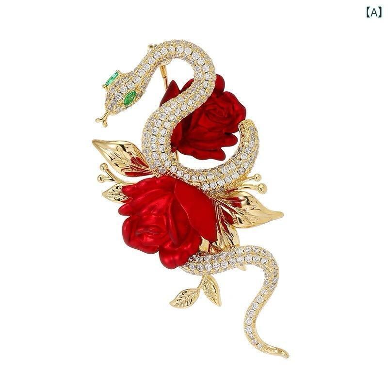 ブローチ 男女兼用 高級感 個性的 動物 ヘビ スネーク 花 フラワー 赤色 レッド 銅製 電気メッキ加工 上品 エレガント ファッション小物 アクセサリー 秋冬
