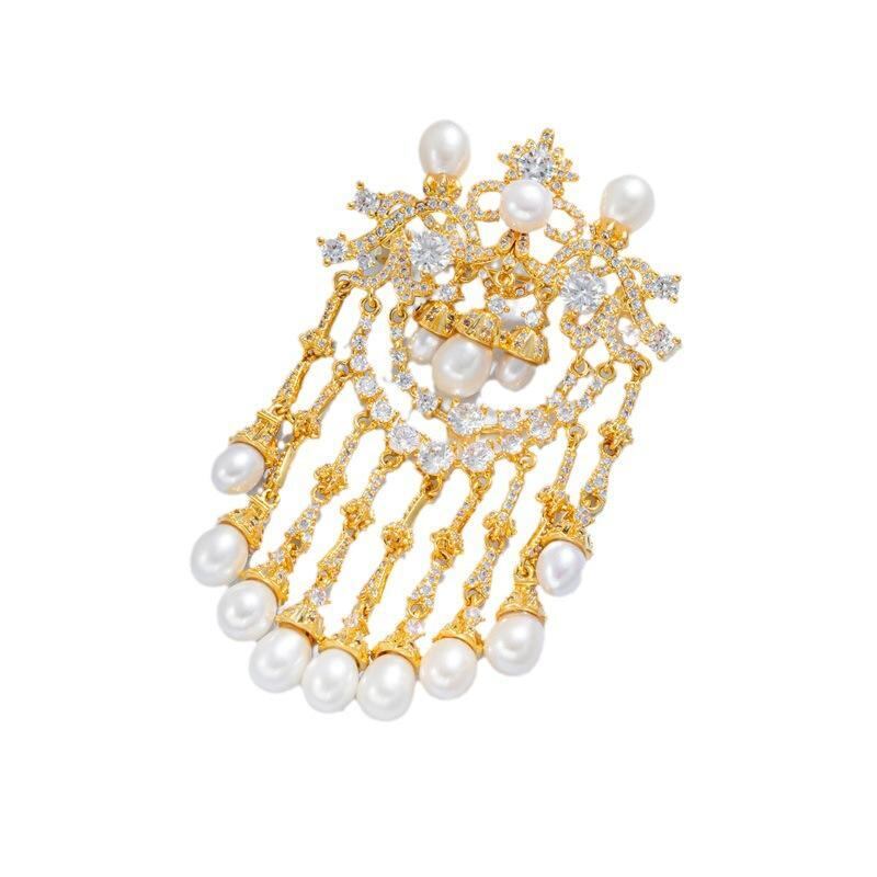 ブローチ レディース 宮廷風 ヴィンテージ バロック 淡水パール クラウン タッセル アンティーク アート 銅製 ゴールド ホワイト 上品 エレガント