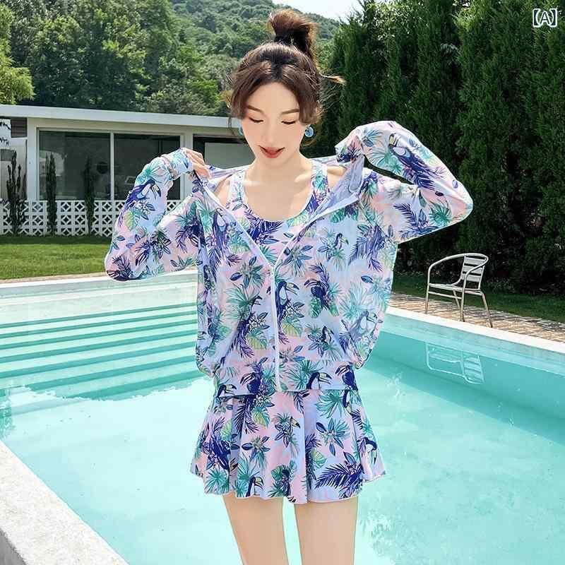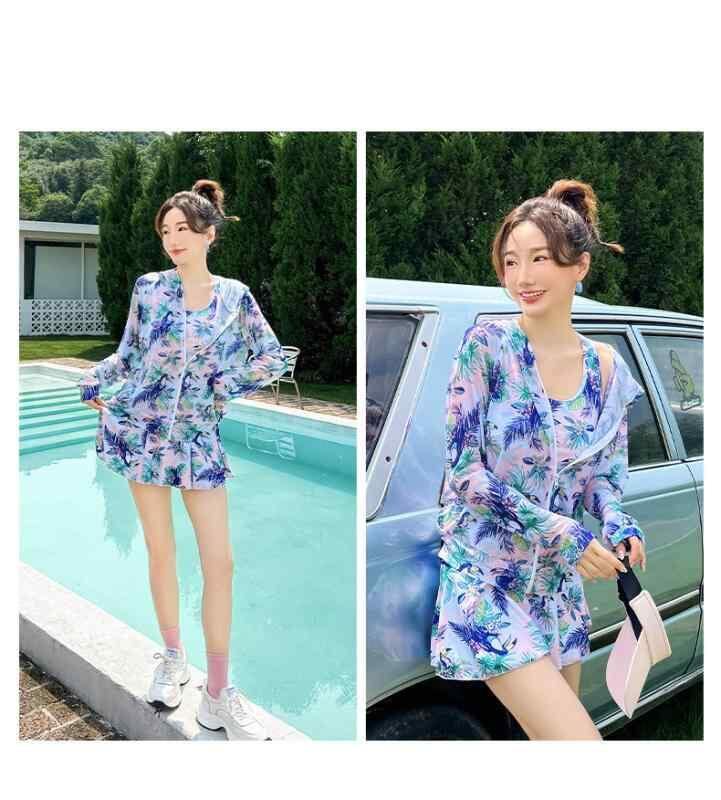 水着 レディース 春夏 セパレート スカートタイプ 長袖 日焼け防止 カバーアップ 3点セット 細見え 体型カバー ゆったり パッド入り ノンワイヤー 花柄 ポリエステル ライトブルー プール ビーチ 海 リゾート