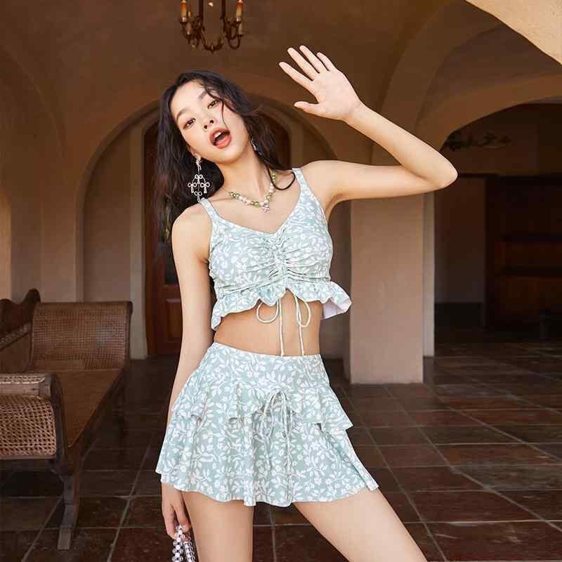 水着 レディース セパレート 3点セット 体型カバー お腹カバー 細見え スタイルアップ 小胸向け 盛りブラ パッド付き ワイヤーなし 温泉 プール ビーチ 海 リゾート 韓国風 かわいい おしゃれ ナイロン素材 軽量 速乾 ライトグリーン