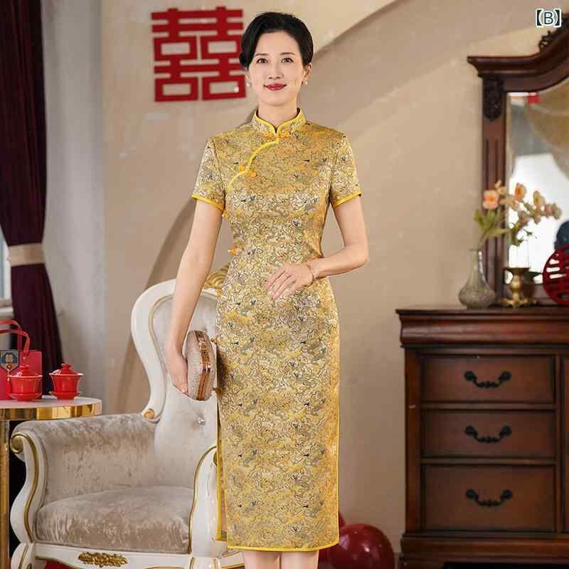 チャイナドレス 母親向け ミセス 結婚式 披露宴 パーティー お呼ばれ フォーマル ドレス ワンピース 大きいサイズ ゆったり 体型カバー モダンチャイニーズ 宋錦織 七分袖 スタンドカラー ミドル丈 春夏 デイリーユース
