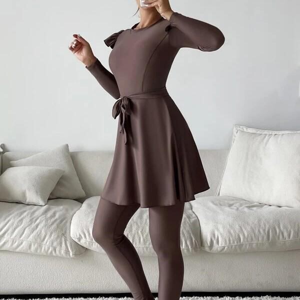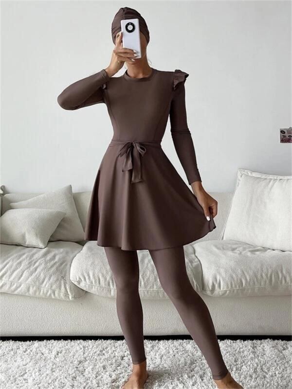 水着 レディース ムスリム アラビア風 体型カバー 長袖 フリル ウエストベルト 3点セット 4点セット カップ付 ナイロン ポリエステル スパンデックス素材 日焼け防止 ブラウン