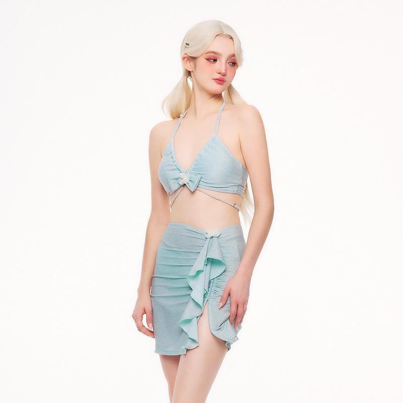 水着 レディース タイ風 セクシー セパレート ビキニ スリーピース 小胸カバー 温泉 リゾート ビーチ プール パッド付き ノンワイヤー ポリエステル ナイロン 春夏 ブルー