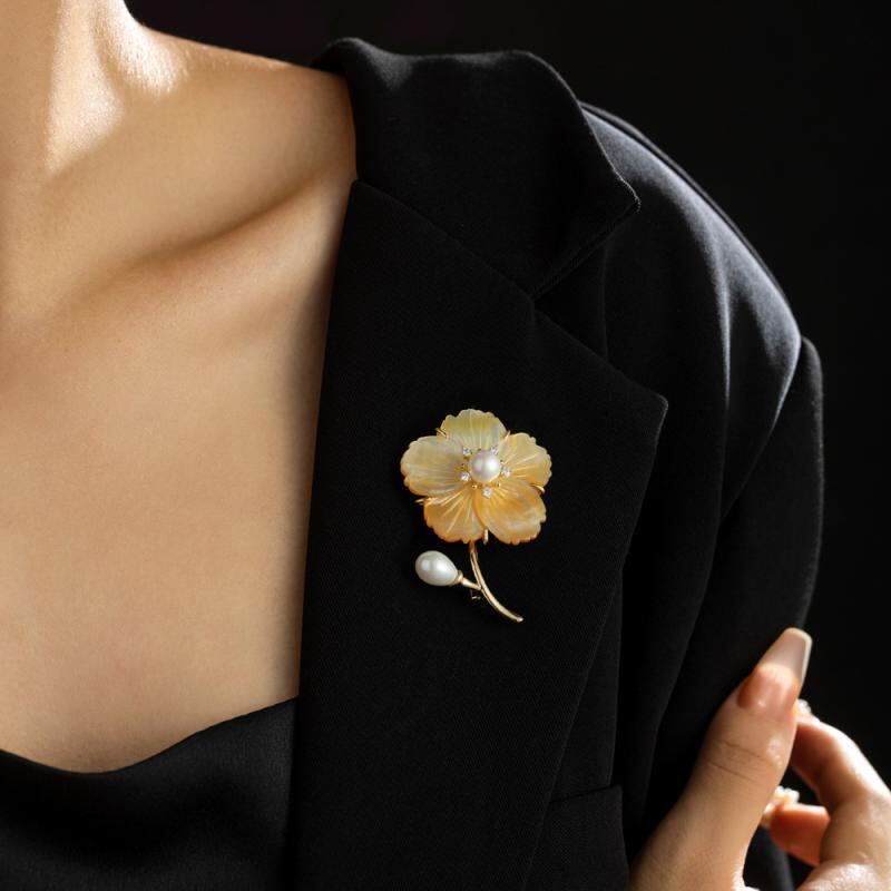 ブローチ レディース スタイリッシュ 高級感 シェル フラワー カメリア エレガント 個性的 アクセサリー 銅製 電気メッキ加工 フェミニン 上品