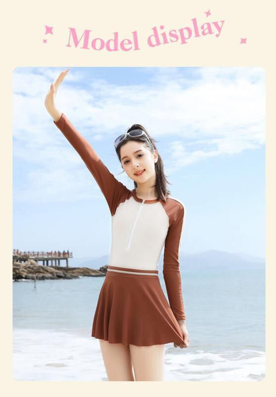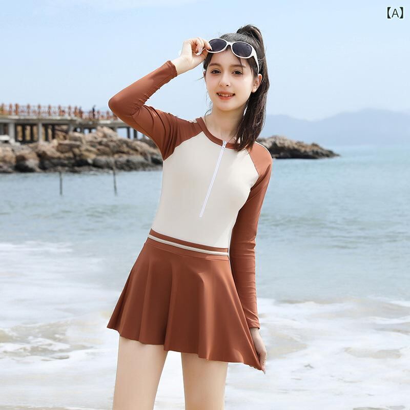 水着 女の子 ジュニア スカート付き 長袖 ワンピース 一体型 スクール水着 スイミング プール 授業用 UVカット ナイロン ポリエステル素材 伸縮性 速乾 キャラメル ブラック 春夏