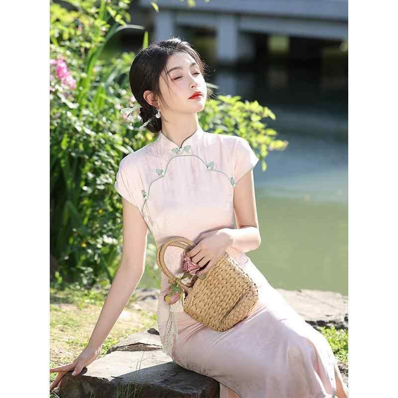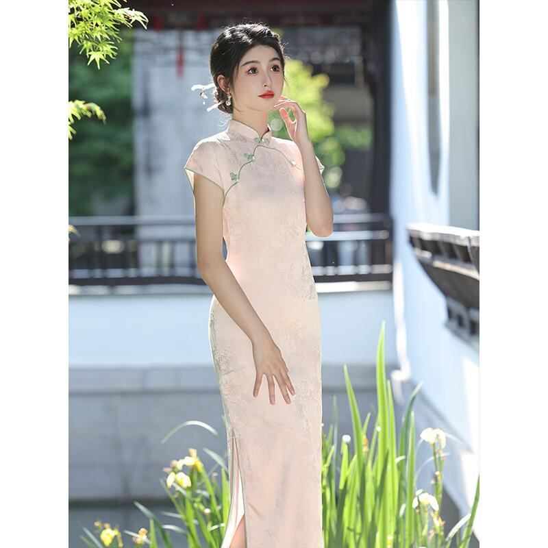 チャイナドレス レディース ピンク ロング丈 改良型 レトロ スタンドカラー 斜め襟 五分袖 ハイサイドスリット エレガント 高級感 ポリエステル 春夏 ワンピース